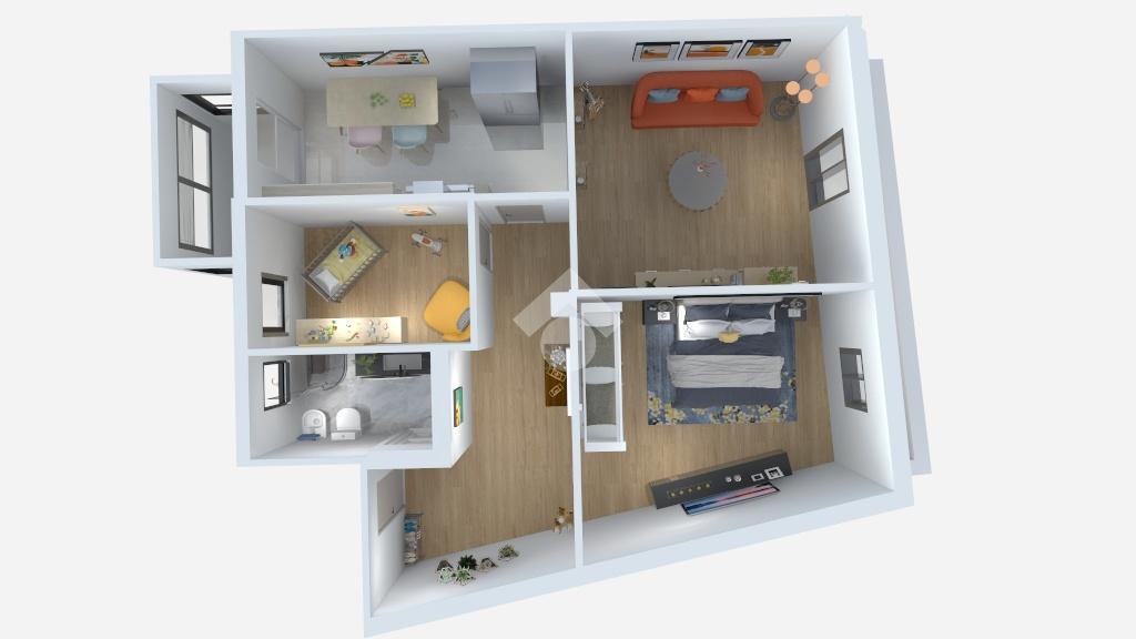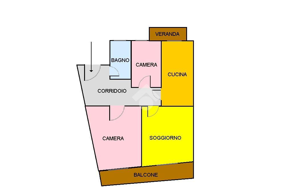 Internamente l'alloggio si compone di un ingresso, un luminoso soggiorno con accesso ad un balcone di generose dimensioni, una camera matrimoniale, una cameretta, una cucina abitabile con veranda e un bagno completo e finestrato.